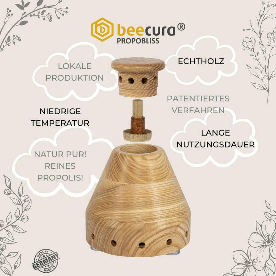 Mit dem beecura® PROPOBLISS holen Sie sich die wohltuenden Eigenschaften von Propolis direkt in Ihre Wohn- oder Arbeitsräume. Dank einer weltweit einzigartigen, patentierten Niedrigtemperatur-Technologie wird das deutsche Qualitäts-Propolis besonders schonend verdampft – für maximale Wirksamkeit und ein gesundes, angenehmes Raumklima. Der geräuscharme Betrieb, das elegante Design und die beeindruckende Betriebsdauer von bis zu 180 Stunden machen den PROPOBLISS zur idealen Lösung für alle, die auf natürliche Weise ihr Wohlbefinden fördern möchten.